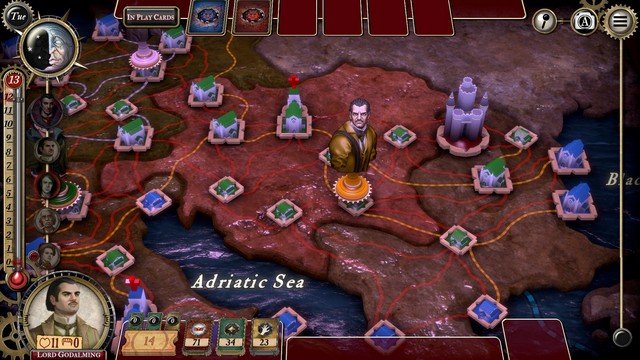 The graphics are really well done, though very dark (I guess that fits the game, though, right?). I like the busts of each figure and how they move around the board (though sometimes the cities can be hard to click if there is too much going on around them).