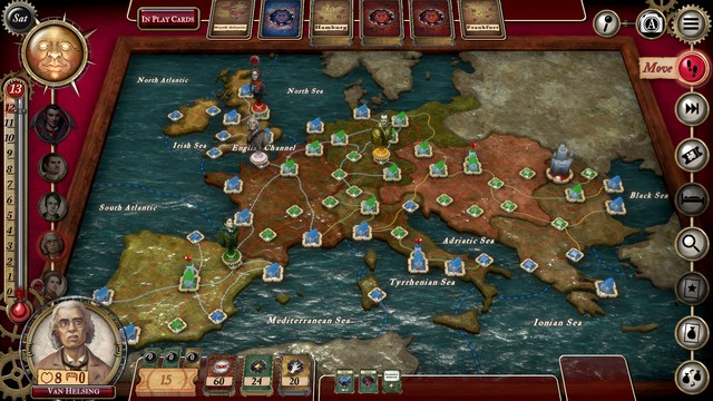 Once each player has done their Dusk action, Dracula gets to move a space, filling the row of cards at the top of the screen with another city card that’s adjacent to where he already is. It could also be a sea zone, which is a blue card and causes him to take 2 points of damage when he moves from land (1 point if he goes from sea zone to sea zone)