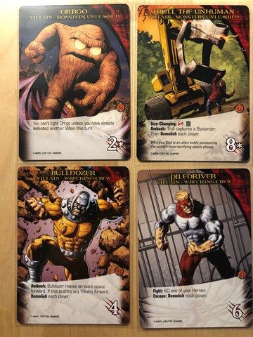 The expansion also brings back the “Demolish” keyword, which means that you turn over the top card of the Hero deck and each player discards a card with the same cost as the revealed hero.