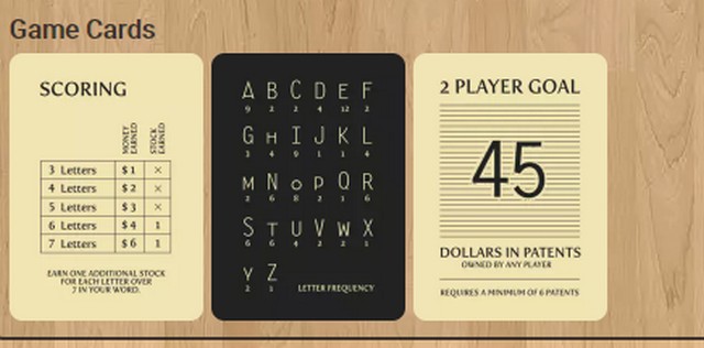 A patent might give you a special ability (The “B” will give you double earnings of both money and stocks if your word begins and ends with a vowel, for example), but all patents will make it so if your opponent uses that letter in their word, you get money! That’s $1 per times the letter is used. So it’s not much, but it’s something.