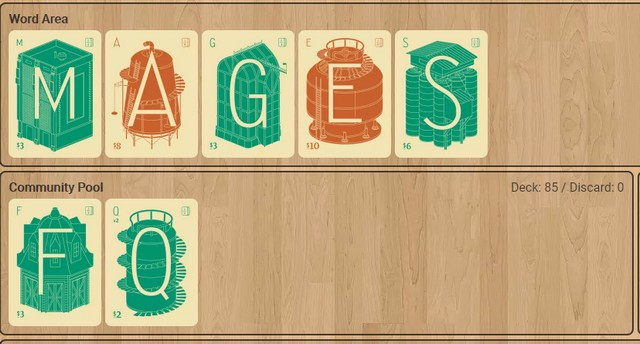Of course, if you can’t figure out a word to spell, your action can be to discard any number of cards from your hand and draw that many. That happens when your 7-card hand inevitably consists of AAEIOOU.
