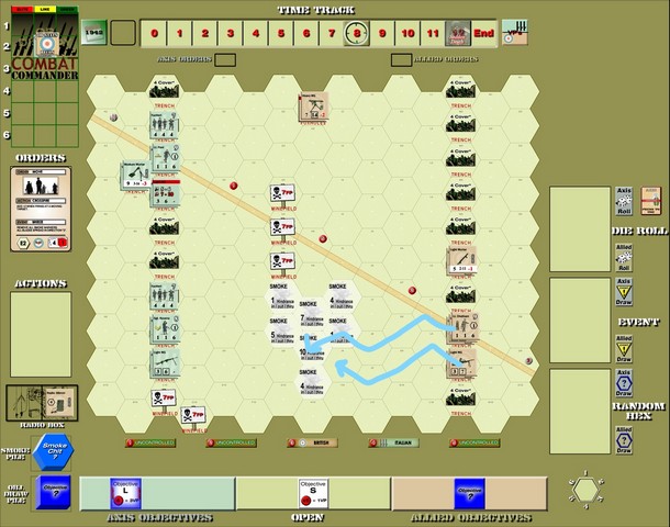 Sean brilliantly used his mortar to extend his smoke screen almost to my lines, including a 10-hindrance smoke right at the tip.