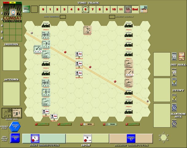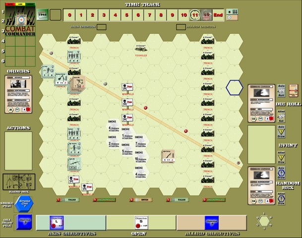 Basically, both the Italians (greenish-blue?) and British (tan) have dug in on their side of the board (a line of trenches on both sides), but the British have snuck a “sniper” into position to harass the Italian lines (in the game, this is a leader with a heavy machine-gun in an advance foxhole).