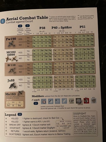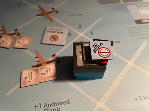 Coming at the bomber formation from two different altitudes and positions gave them the Position Advantage, which allows you to cancel one hit against your fighters. Haase would have taken a really bad hit to his Engine so that quickly got cancelled.