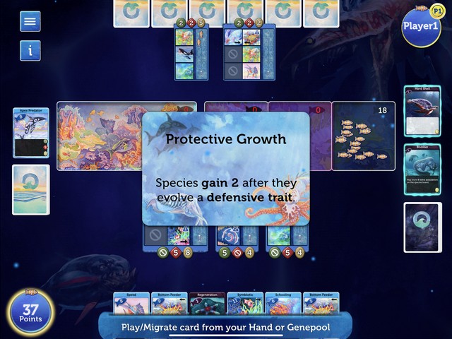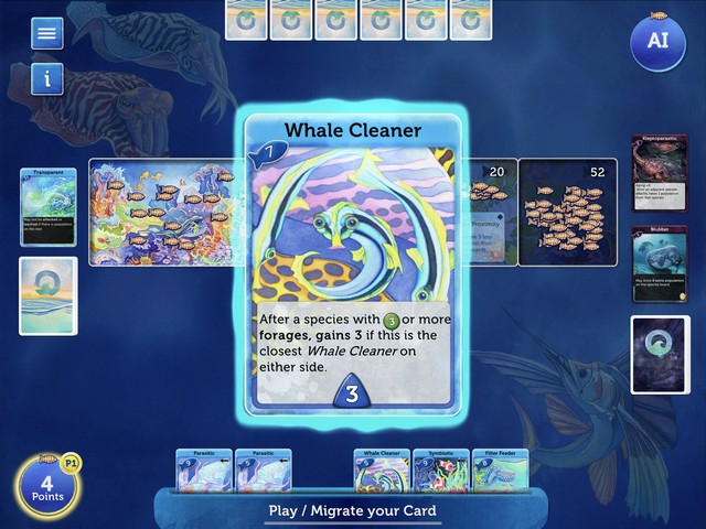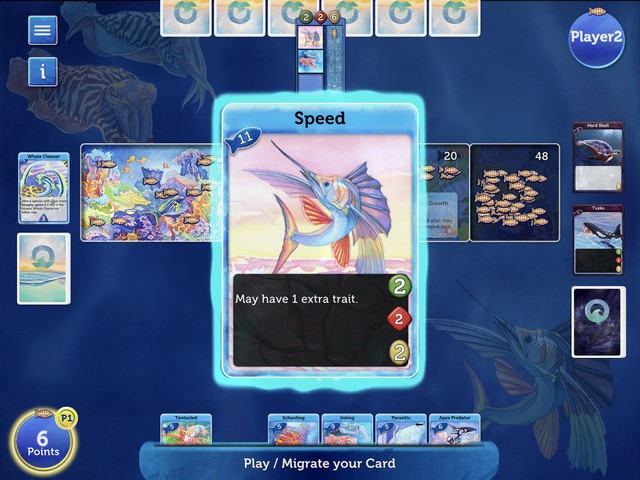 Everything in the app is laid out nicely. The Reef and Ocean boxes, the discard pile where you place a card to migrate fish from one box to another, even your own hand.