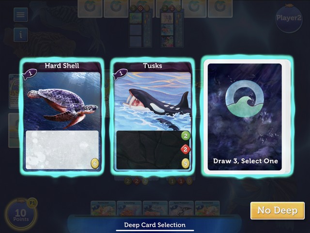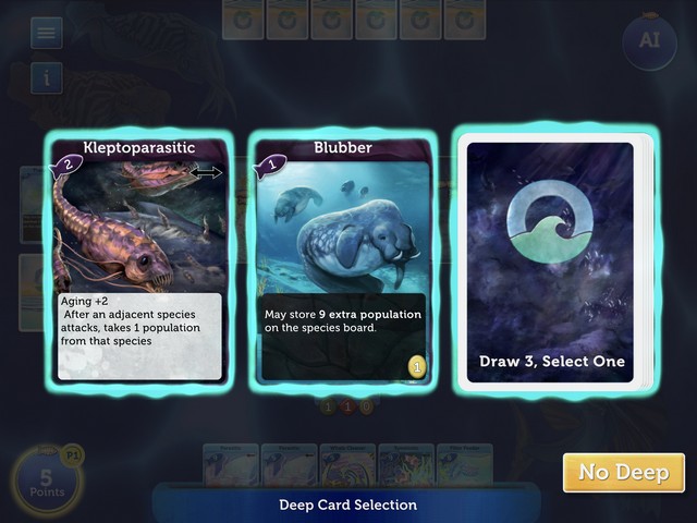 Once all of your species have aged, you can draw a “Deep” card if you wish. Either take one of the two that are face-up or draw 3 from the deck and keep one.