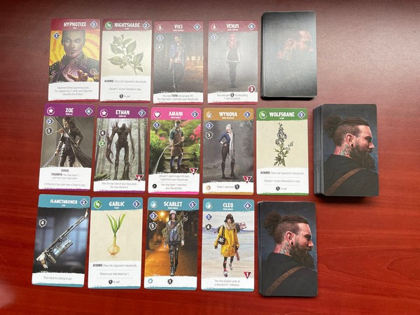 Plants (like the Nightshade above) are placed in the opponent’s discard pile when purchased. When they come up in the player’s hand, they have to play them first (unless they have a card that can destroy it), take the damage it says, and do anything else that it says (like discarding a Groupie that’s in play if the Nightshade comes up).