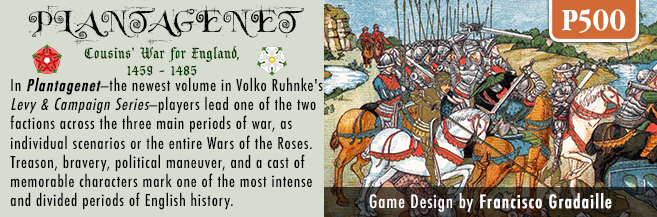 “Designer Francisco Gradaille adds overall and local political influence to Volko’s medieval operation system to reflect the ever-changing loyalties of the time while keeping play familiar to fans of the Series. Players will create and maintain a network of allied lords and nobles in order to obtain the provender and coin needed to supply and pay their armies. As ravaging and looting will damage each side’s reputation, each faction will strive to convince cites to join its side. Great battles will seek to kill or capture enemy lords—perhaps even a king. Two kinds of operational moves will be in play: the military and the political.