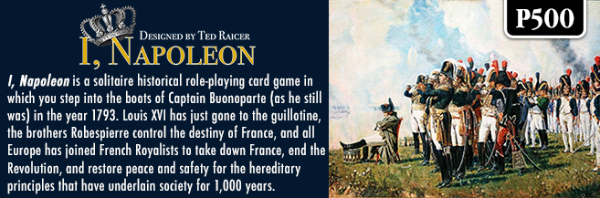 I, Napoleon is a solitaire historical role-playing card game in which you step into the boots of Captain Buonoparte (as he still was) in the year 1793. Louis XVI has just gone to the guillotine, the brothers Robespierre control the destiny of France, and all Europe has joined French Royalists to take down France, end the Revolution, and restore peace and safety for the hereditary principles that have underlain society for 1,000 years.