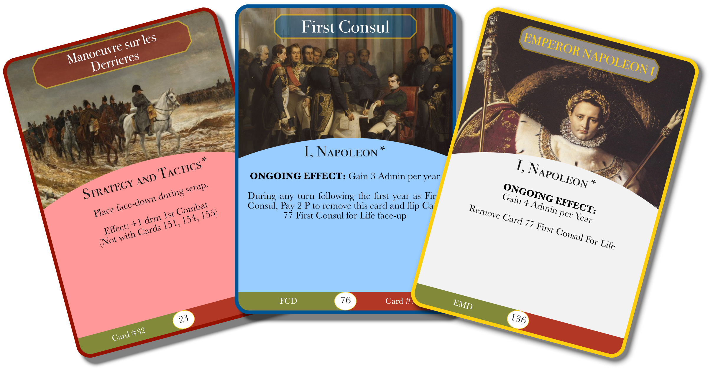 Cards are divided into three decks that represent different time periods in Napoleon’s life.
