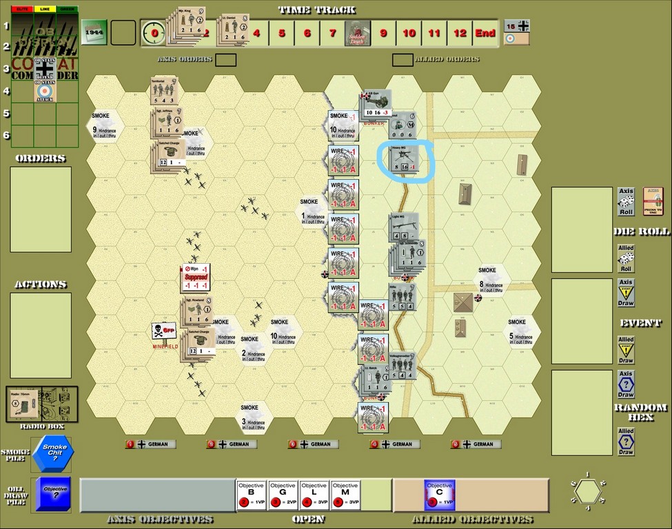 The Germans quickly recovered their broken units, with one of the rolls causing a German sniper. While the sniper didn’t do anything, the random hex fixed the broken HMG!