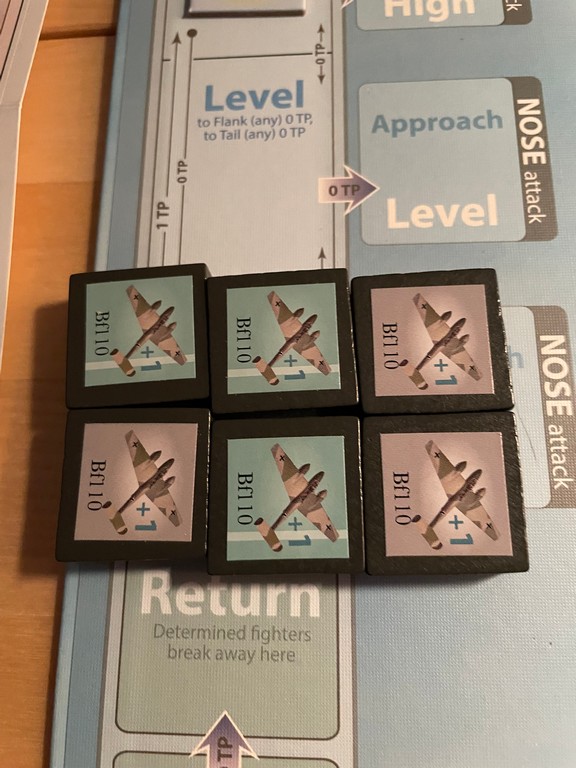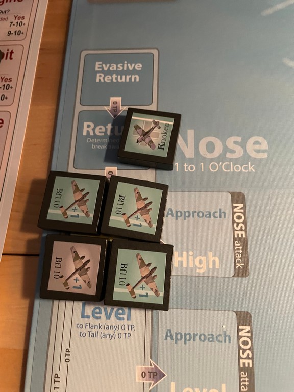 The second 110 did a 1-point Fuselage (Gunner) hit to a bomber and took a hit that’s nullified by Position Advantage (I don’t want to lose any more Operations Points next mission by having a 110 crash or something).