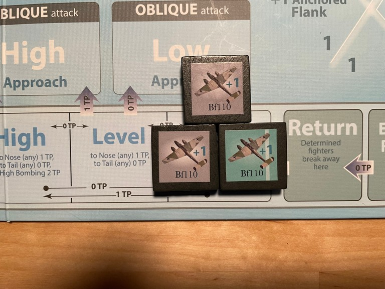 The first 110 does a 4-point Wing hit to its bomber but takes 2 hits himself (one negated by Rotte Advantage and the other is a Wing hit). He also gets a “Ride the Tail” result which means it will attack again.