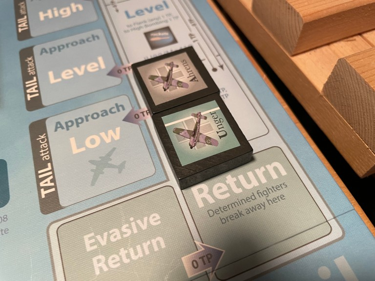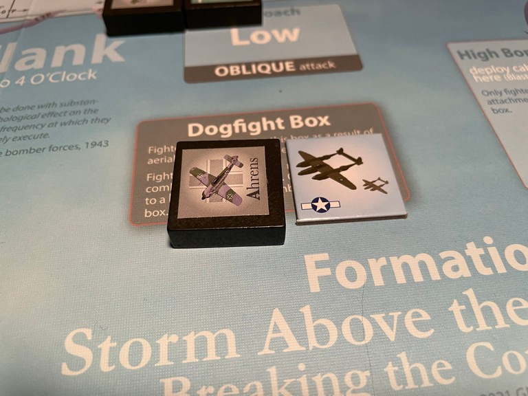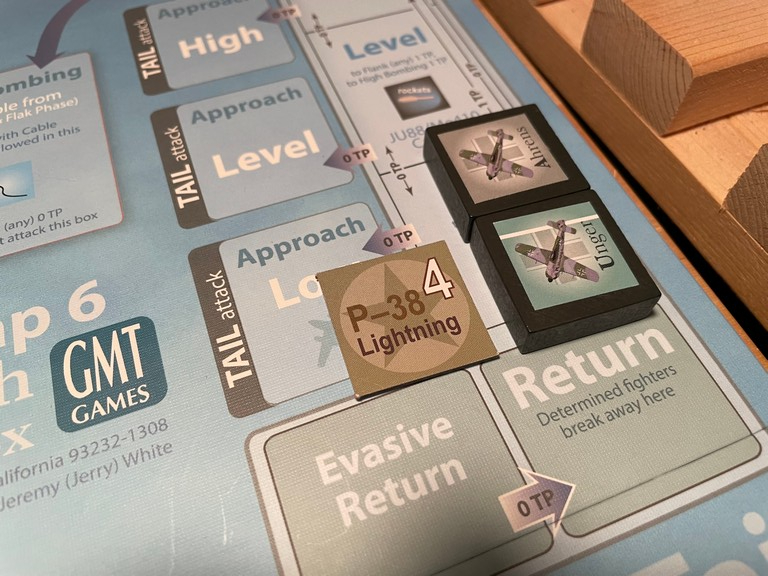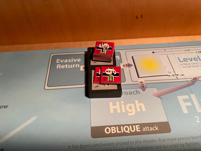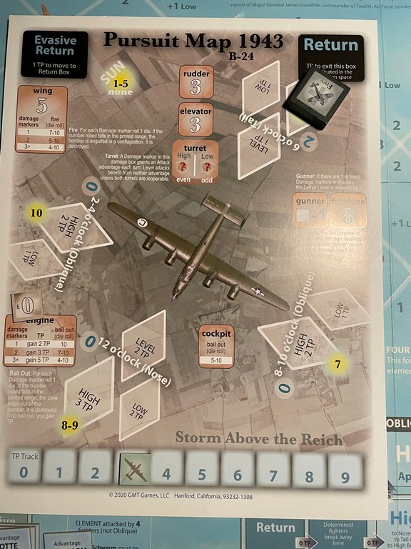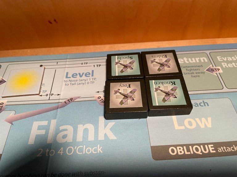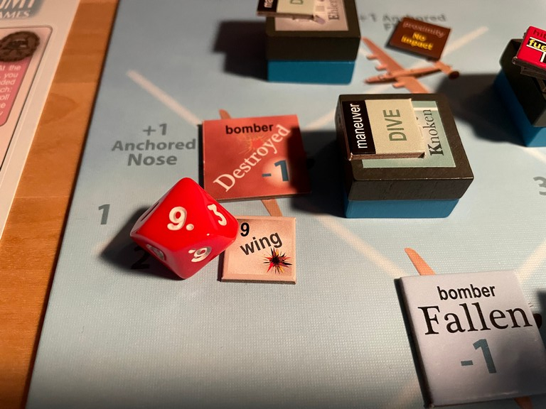 Frisch goes after the bomber with 1 Engine damage marker. He successfully pursues it and comes in Tail High (there is no Sun for this one).