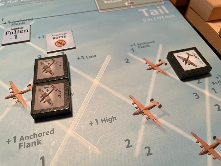 Just to remind you, I am using the “Advanced Rules” for pursuing Fallen bombers, which means that I have to actually destroy a bomber to get VP. I don’t get any for just knocking the bomber out of formation.