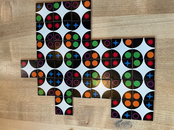 There are five colours/symbols (good for colourblind people!) on the various tiles and you will be placing them to matching tiles and scoring points that way.