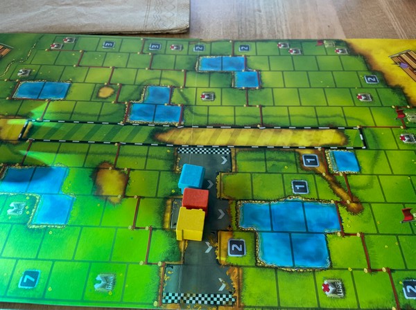 The board is a race track where you are trying to go around it and cross the finish line first (or furthest if more than one of you cross on the same turn).
