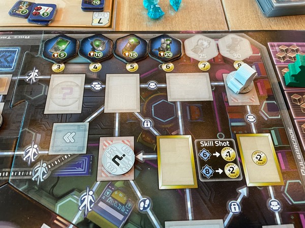 Assuming you don’t bust, though, you can spend Feet on the dice you roll to move your figure on the track. You can try to land on spaces that give you bonuses (like credits or trashing one of your terrible dice) or just try to win the game by moving forward.