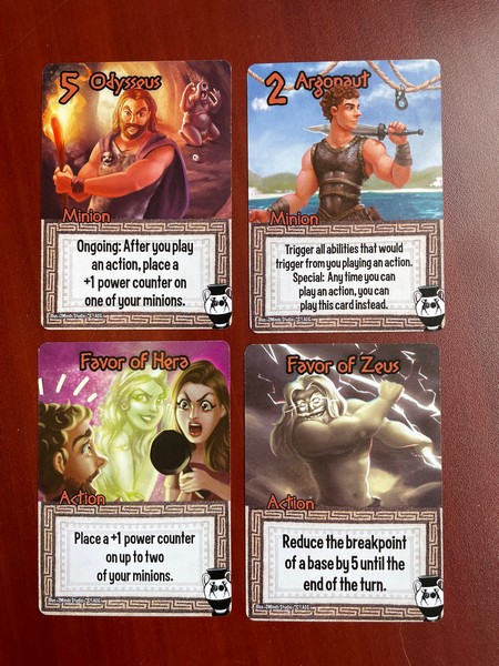 The Spartans (not pictured) are only 3-power minions, but they can get bumped up quickly. That’s because you place a +1 power counter on them the first time you play an action on your turn. It doesn’t trigger on all actions like Odysseus does, but even so it’s quite powerful.
