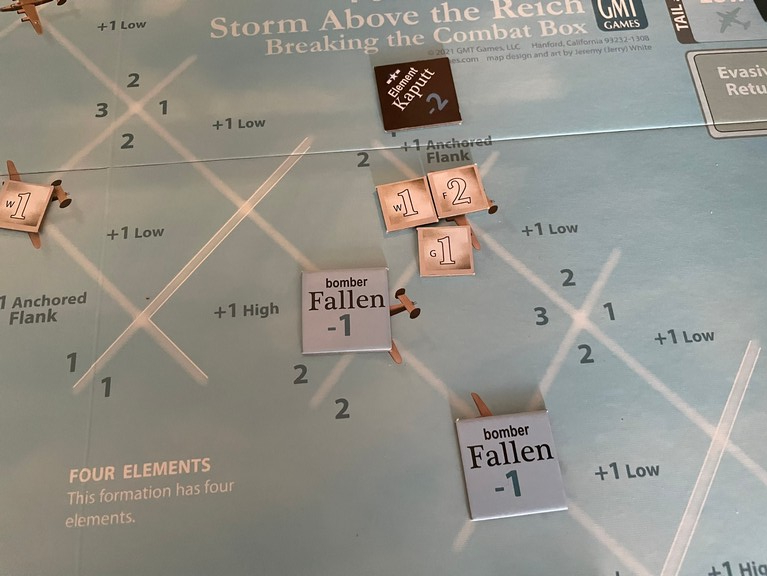 Both elements with wounded bombers lose cohesion. The one I’ve been attacking becomes Kaputt (-2 to the Lethal Level of all spaces in it) and the other one becomes Loose.