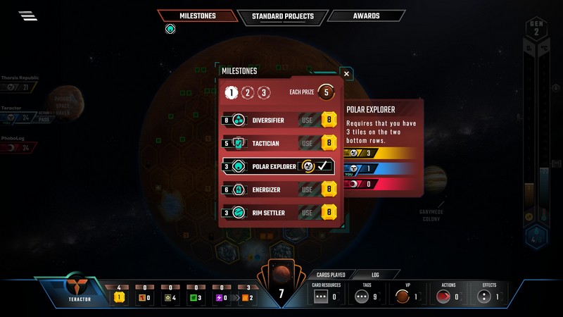 Polar Explorer is shown above, requiring you to have 3 tiles in the bottom two rows. Energizer requires 6 Energy production and Rim Settler needs 3 Jovian tags.