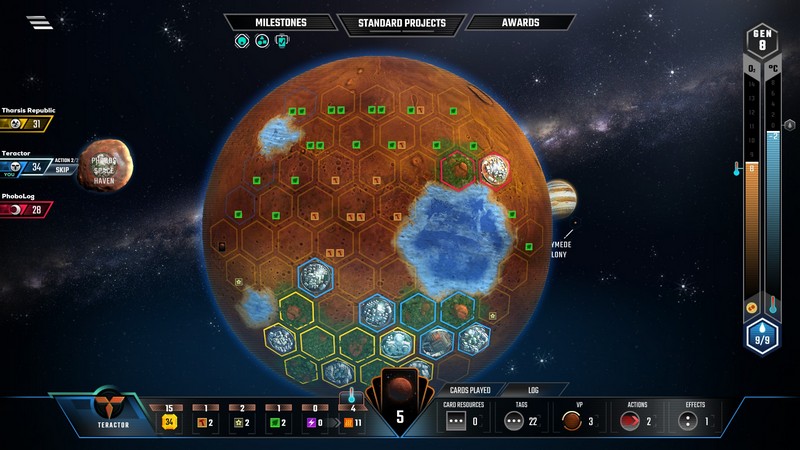 First, Hellas has a space right at the South Pole (seen at the bottom of the picture above), when you place a tile there, you can pay 6 megacredits (MC) and place an ocean tile anywhere. That’s a free TR! (Ok, 6 MC TR, but still…)