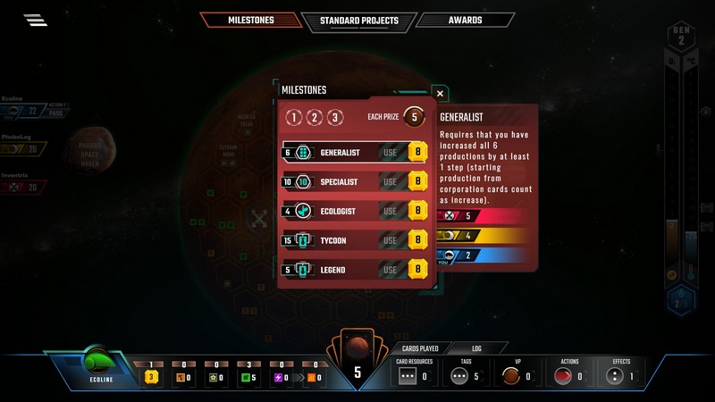 There’s the Diversifier, which requires a player to have 8 different tags in play. Tactician works for the player who has played at least 5 cards with requirements (<=7% Oxygen, for example).