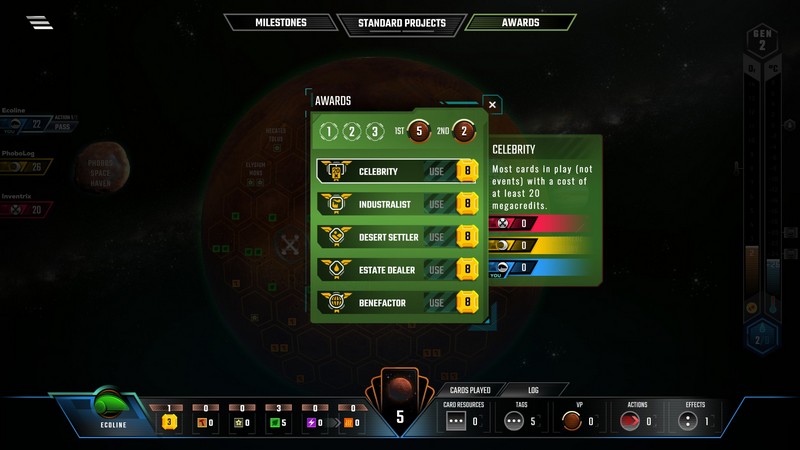 For awards, you have Celebrity (most cards in play that cost 20 or more, not events). Industrialist is whoever has the most steel and energy resources (not production). Desert Settler is given to whoever has the most tiles in the bottom four rows (away from the huge ocean). Estate Dealer is for whoever has the most tiles adjacent to ocean tiles.