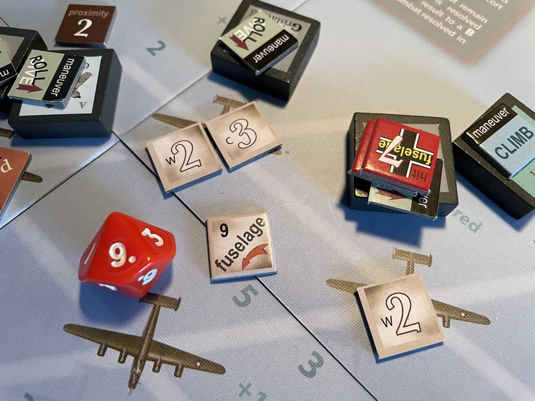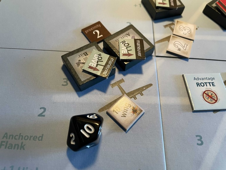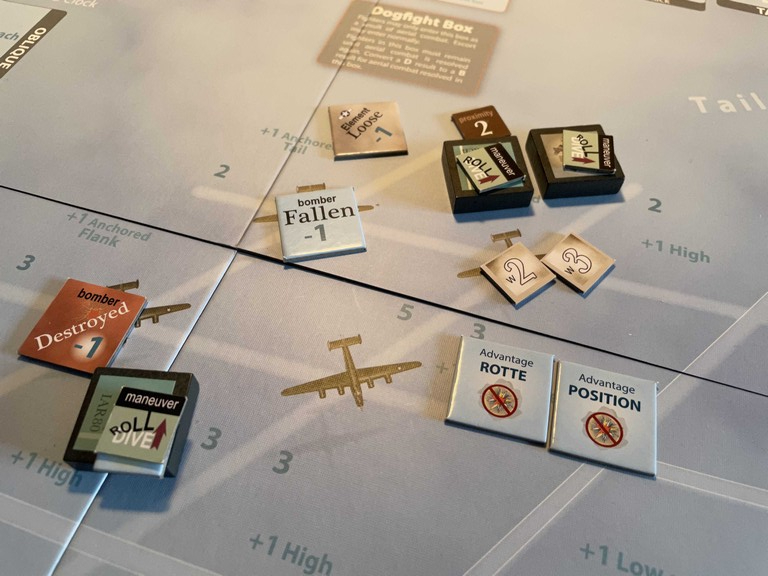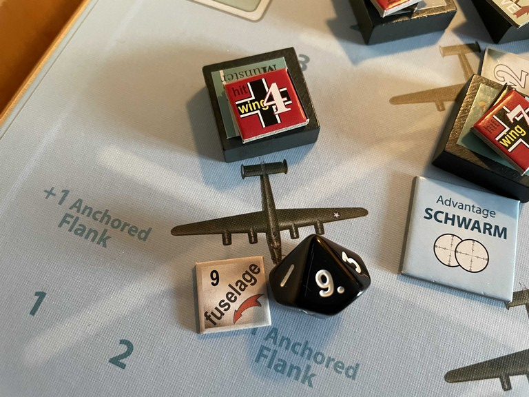 Using the remaining Schwarm hit, Ahrens knocks the wounded bomber out of formation with a Fuselage (Elevator) hit (turns out I did this wrong as the Schwarm hit has to be done to the bomber that the fighter is already attacking, I believe).