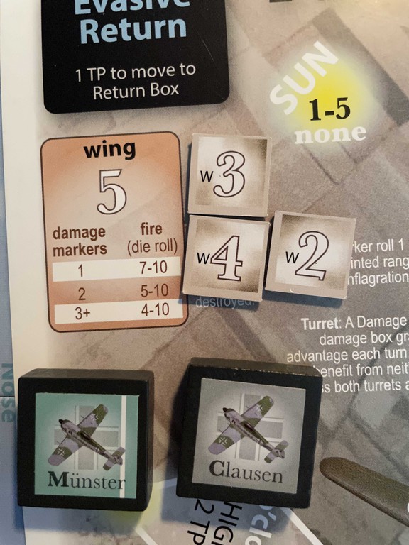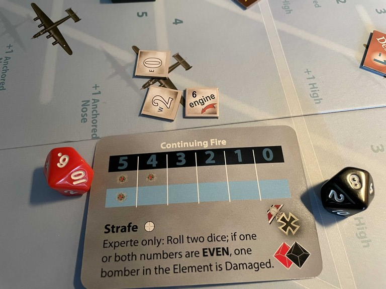Clausen gets a Strafe event, rolls an even number, and knocks his bomber out of formation with an Engine hit!