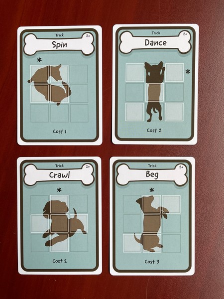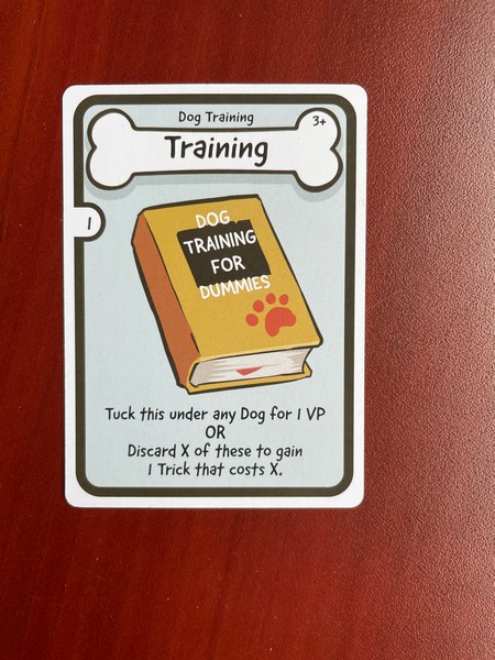 Training cards can either be tucked under a dog (again, only one per dog unless the dog has a trait adjusting that rule) or you can keep them and then spend them to buy new tricks.