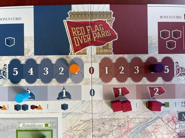 Another critical addition, which adds a sort of asymmetry, is that the Momentum track and the cube pools. Versailles can keep as many cubes as they get from the Crisis track but the Commune can only hold cubes in their cube pool if their Momentum allows them to.