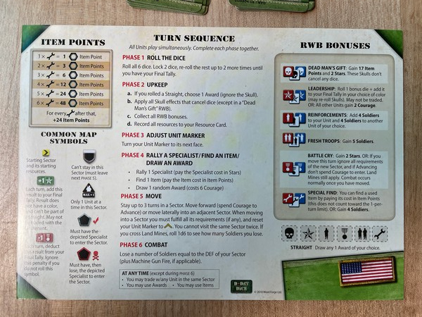 Each turn, you roll your dice, Yahtzee-style (3 times, keeping dice you want and rerolling the rest) to try to get more troops, points to get more equipment or bonuses, or maybe “courage” that will let you advance up the map.