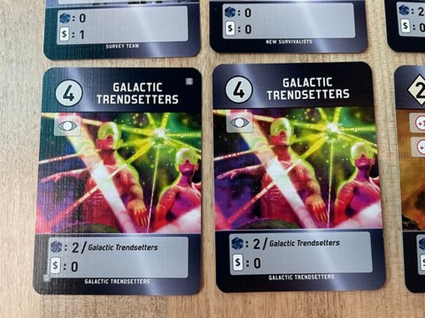 The artwork, for the most part, is straight out of Race for the Galaxy, but there’s nothing wrong with that. It’s very good (though the Galactic Trendsetters are a bit weird-looking, but maybe that’s the intent!)