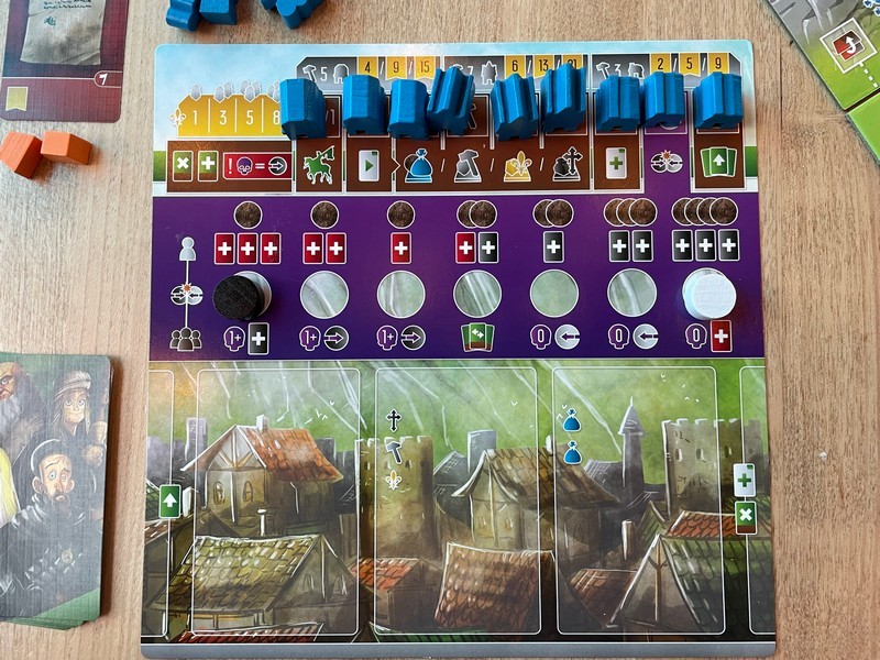 Each player board has a track with virtue and corruption starting on opposite sides.