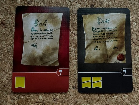 If the Debts run out (the black card), then players will gain points for having flipped the most Deeds.