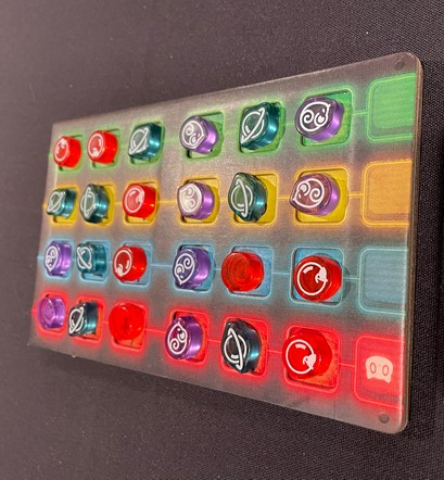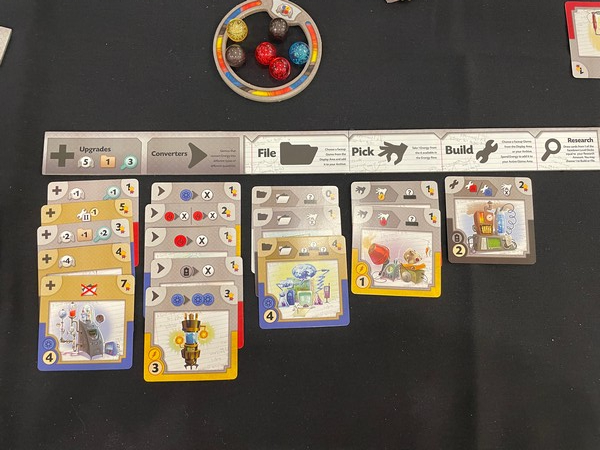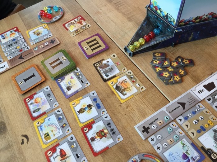 Gizmos is an engine-building game where you are using energy that you pick up from the marble feeder to build gizmos to your tableau.