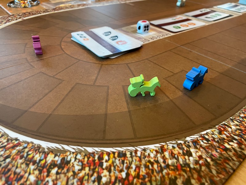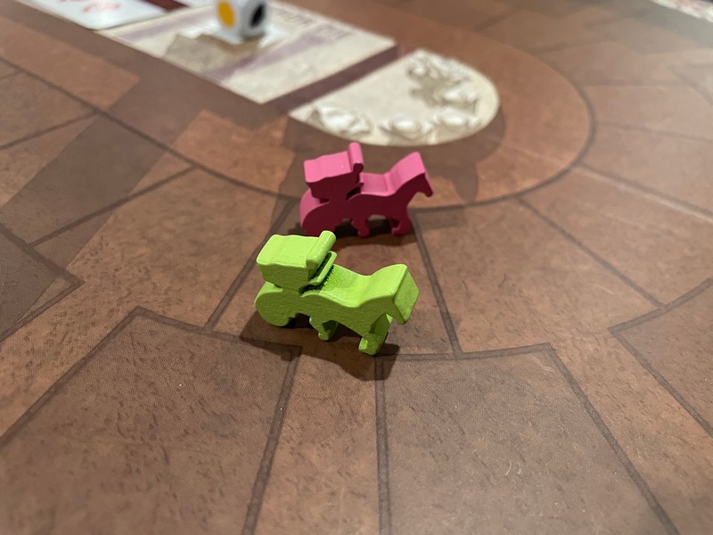 Sean with the pink chariot was on the inside track while my green was on the outside. Since we ended up in the same space, the inside track wins.