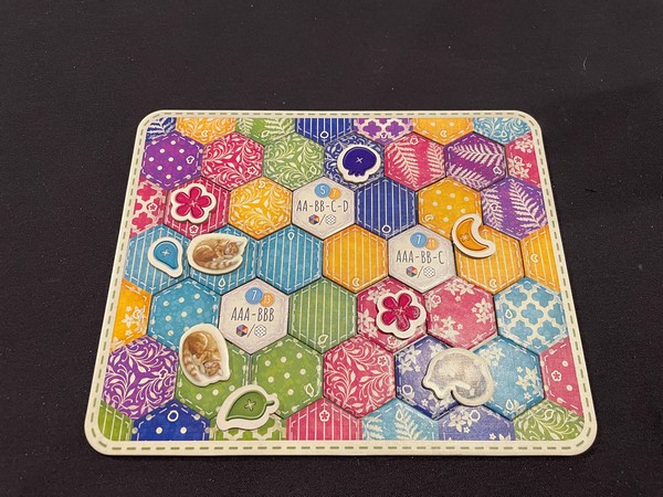 You are essentially drafting quilt tiles to form patterns on your quilt. You get points for getting coloured tiles next to each other, goal tiles that you need to surround with the appropriate types of tiles, and then there are cats that are attracted to certain patterns on your quilt.