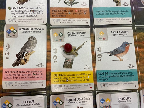 I had two bonus cards that I was easily able to achieve: have at least 8 cards in my hand and have at least 7 birds that can live in multiple habitats.