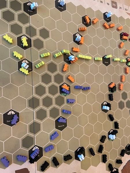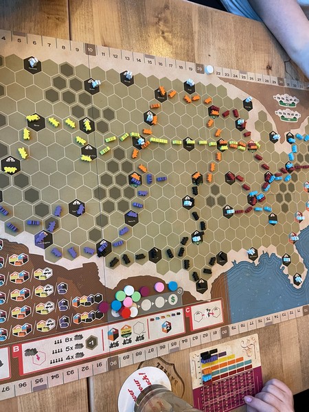 This is kind of an 18XX-light game in that each round, you will be choosing which colour of rail to get another stock share in.