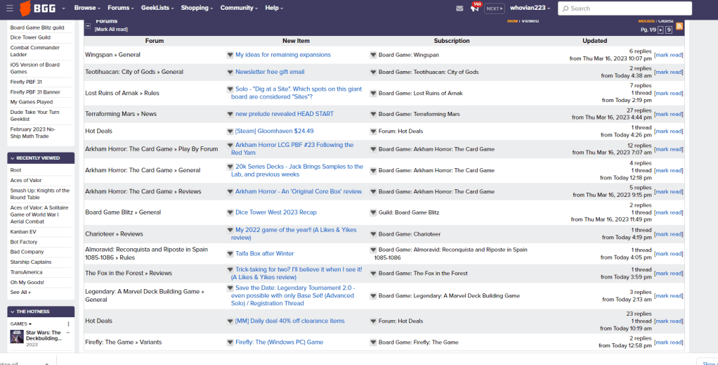 One thing I wish is that you could avoid subscribing to individual forums within a game. If I don’t want to subscribe to “Play By Forum” (PBF) games of Arkham Horror: the Adventure Card Game but I want to subscribe to the Rules forum, I wish I could do that. But I don’t think you can (or my limited brain power hasn’t figured out how to do that).