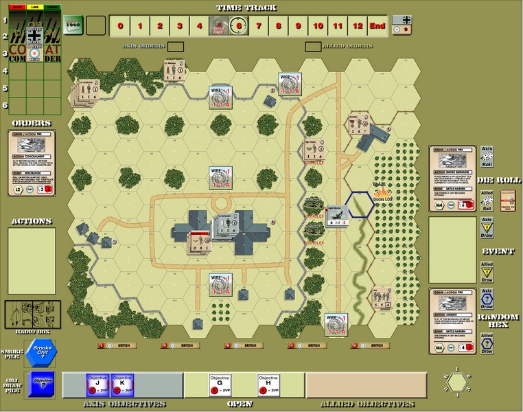 The Germans (grey) set up first and can start up to 9 hexes from the right side of the board. The British set up last and start up to 2 hexes from the left side of the board.