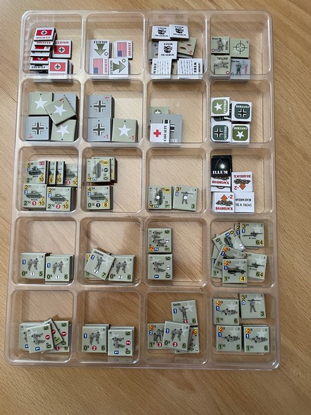 The US counters are on the bottom along with various neutral counters (control, hero, concealment, wire, assault, etc). The US counters are separated by platoons as well as vehicle platoons and individual counters for MGs and bazookas.