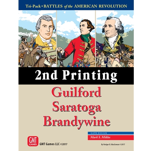 The P500 reprint is The American Revolution Tri-Pack (2nd Printing), repackaging three older American Revolution games from designer Mike Miklos: Saratoga, Guildford and Brandywine.