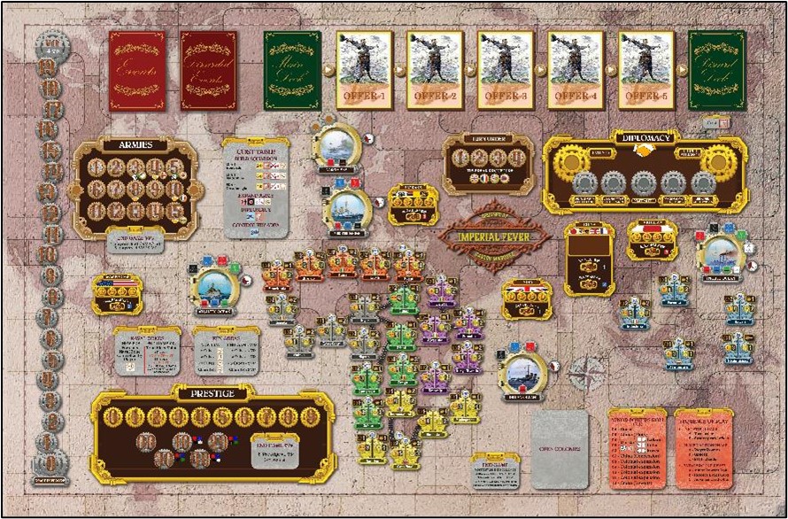 “Imperial Fever is a deckbuilding game for three to four players that recreates the period between 1881 and 1915. Players will vie for world dominance as they take on the roles of the United Kingdom, France, the Central Empires (Germany and Austria-Hungary), and the Emergent Powers (the USA and Japan).“