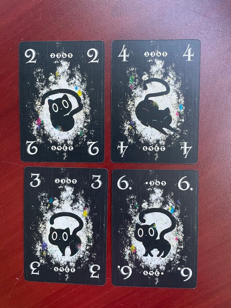 Cat in the Box is the same as many trick-taking games in that it has multiple cards numbered 1-9. There are actually five of each number, making a deck of 45 cards if you play with the full five players. You will be taking out the “9” cards for four players and the “7-9” cards for 3 players.
