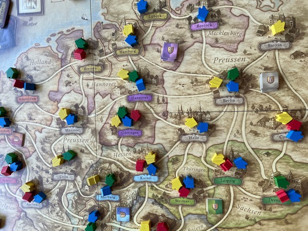Also, when you score a route, you can choose to either place houses in all of one of the city colours on your route, or you can choose one of each colour.