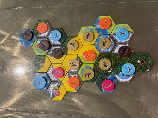 I love the tile-laying, but also the bingo aspect of calling out elements to try and complete cards that will let you actually put out tiles (or animals, or other elements, or just got a bunch of points)