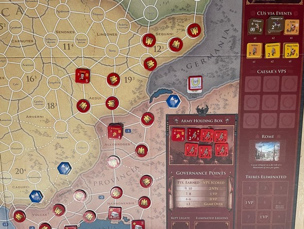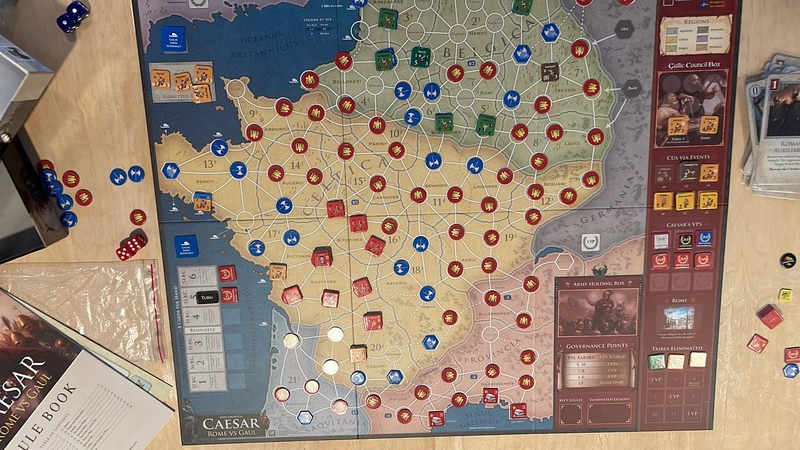 I was the Gauls against Caesar’s Roman legions, and a large part of my game was trying to lay influence out, occasionally taking an offensive action or two to try and pick off a couple of isolated legions.